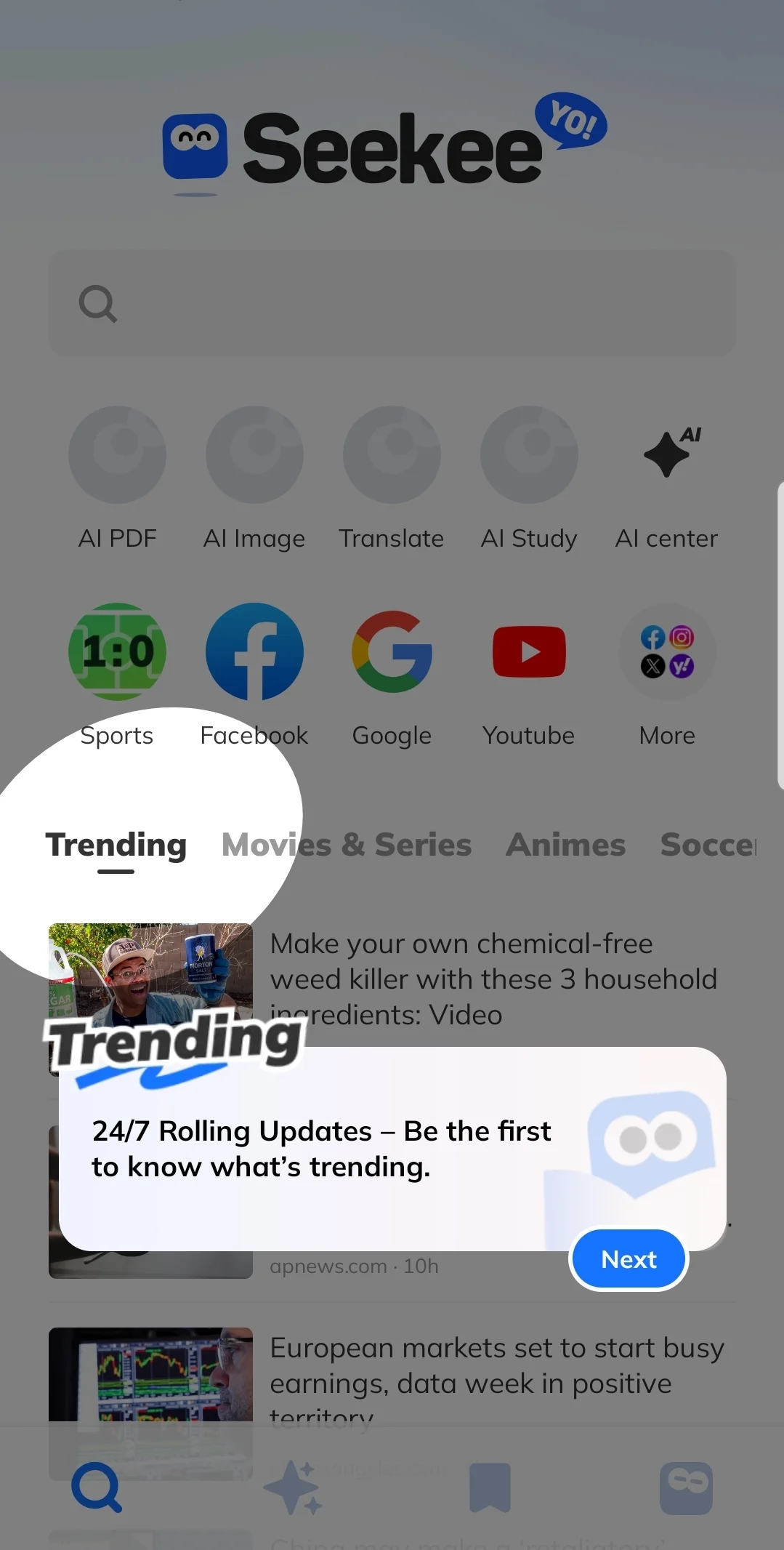 Al proporcionar actualizaciones en tiempo real y resultados de búsqueda inteligentes, Seekee mantiene a los usuarios informados sobre las tendencias globales y las últimas noticias en diversos campos como deportes, finanzas y entretenimiento. Ya sea que busques los últimos titulares o tus programas de televisión favoritos, Seekee ofrece acceso rápido, preciso e inteligente al mundo digital.
